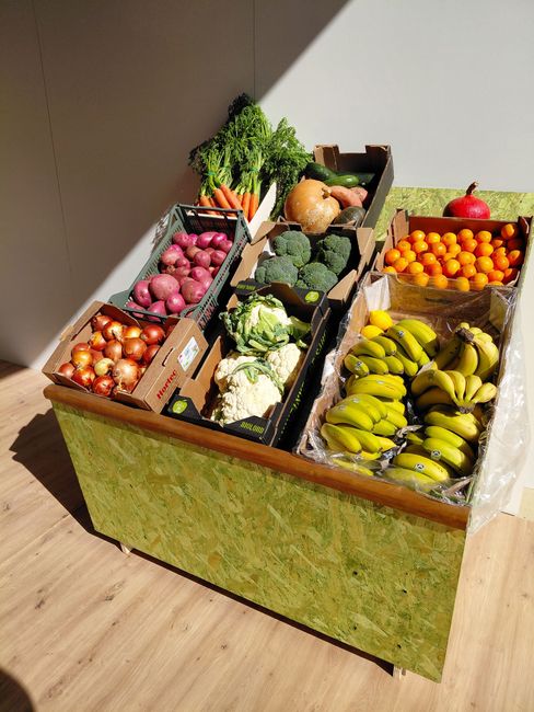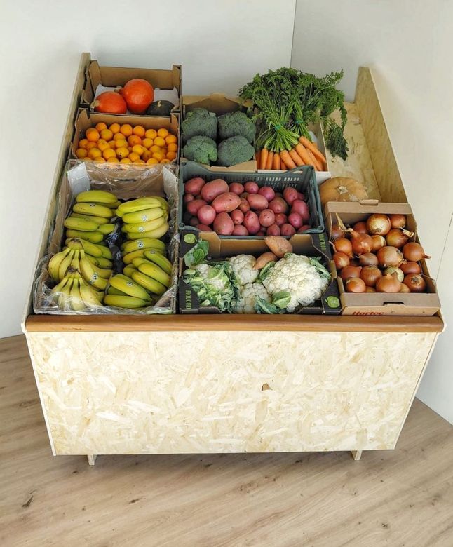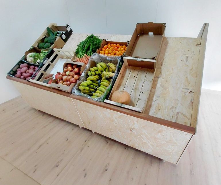 El mueble CADUA es un sistema modular y desmontable diseñado específicamente para fruterías. Permite crear diferentes configuraciones, como muebles sueltos, líneas de fruta contra la pared e islas de fruta, todo sin necesidad de tornillos.